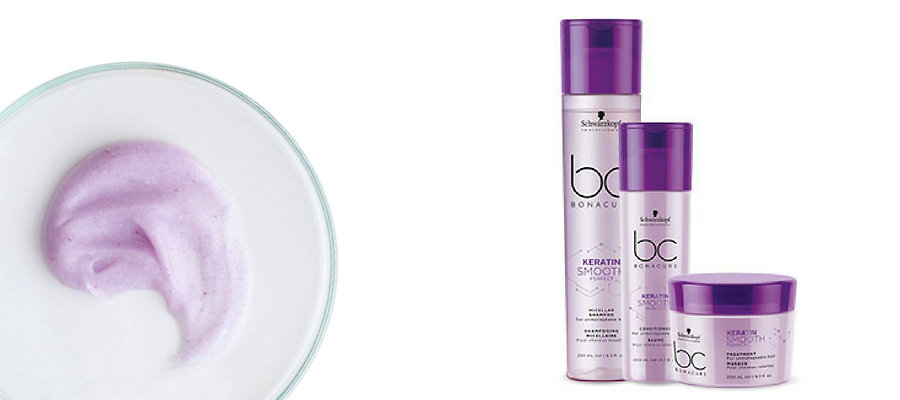 Keratin je základním stavebním kamenem buněk, které zajišťují správnou funkci pokožky. Ve vlasové kosmetice pomáhá keratin vyživit a zkrotit hrubé, nepoddajné a krepaté vlasy tím, že uhlazuje jejich povrch, utěsňuje kutikulu a chrání vlasové vlákno před vlhkostí a poškozením z tepelných nástrojů. Tím se vlasy stávají hladší, hebčí a jsou 100% bez krepatění a poletování. Nyní můžete keratin doplnit i svým vlasům s řadou BC Keratin Smooth Perfect.