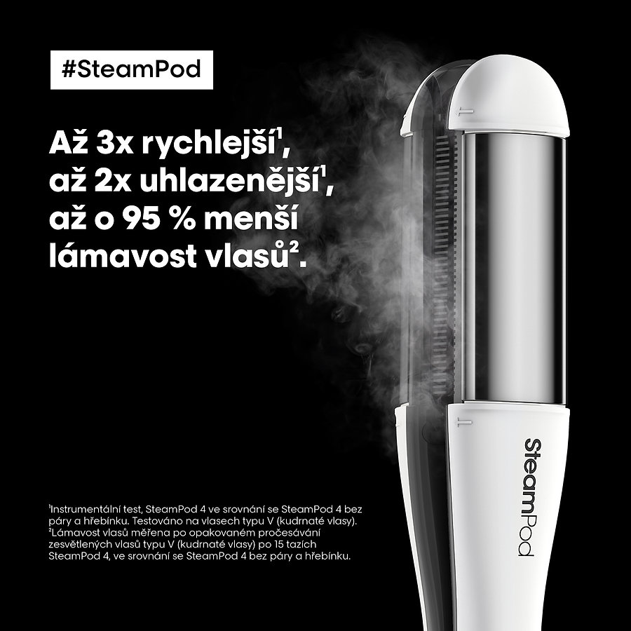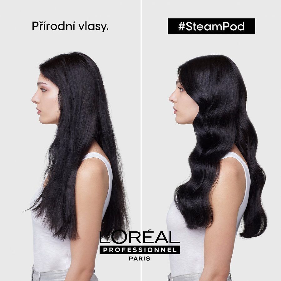 Dokonale rovné vlasy? Pružné výrazné nebo ležérní vlny? Možnosti parní žehličky na vlasy SteamPod 4 neznají hranic! Čtvrtá generace parní žehličky od L’Oréal Professionnel vám díky patentované parní technologii poskytne profesionální a šetrný styling v pohodlí vašeho domova. Poradí si i s těmi nejnepoddajnějšími vlasy – rychle a šetrně i při nízké teplotě. Objevte nové exkluzivní funkce, příslušenství a ergonomičtější design a vytvořte si každý den účes jako od kadeřníka! Dopřejte si okamžitou proměnu vašich vlasů: snadno dosáhnete dokonale uhlazených vlasů hebkých a přirozených na dotek, či volně vlnitých pramínků.