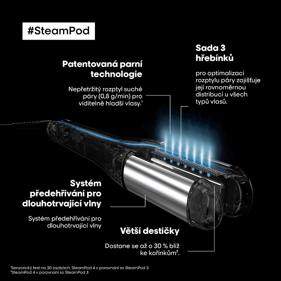 Žehlička SteamPod 4 využívá patentovanou technologii páry. Díky kombinaci tepla a páry nabízí rovnováhu mezi tepelnou úpravou a kondicí vlasů. Z destiček se nepřetržitě rozptyluje suchá pára, která v malém okamžiku vytvoří viditelně uhlazené vlasy a zaručuje hydrataci každého pramenu. Pára navíc vlasy fixuje, a proto odolávají krepatění a zachovávají si dlouhodobý efekt.