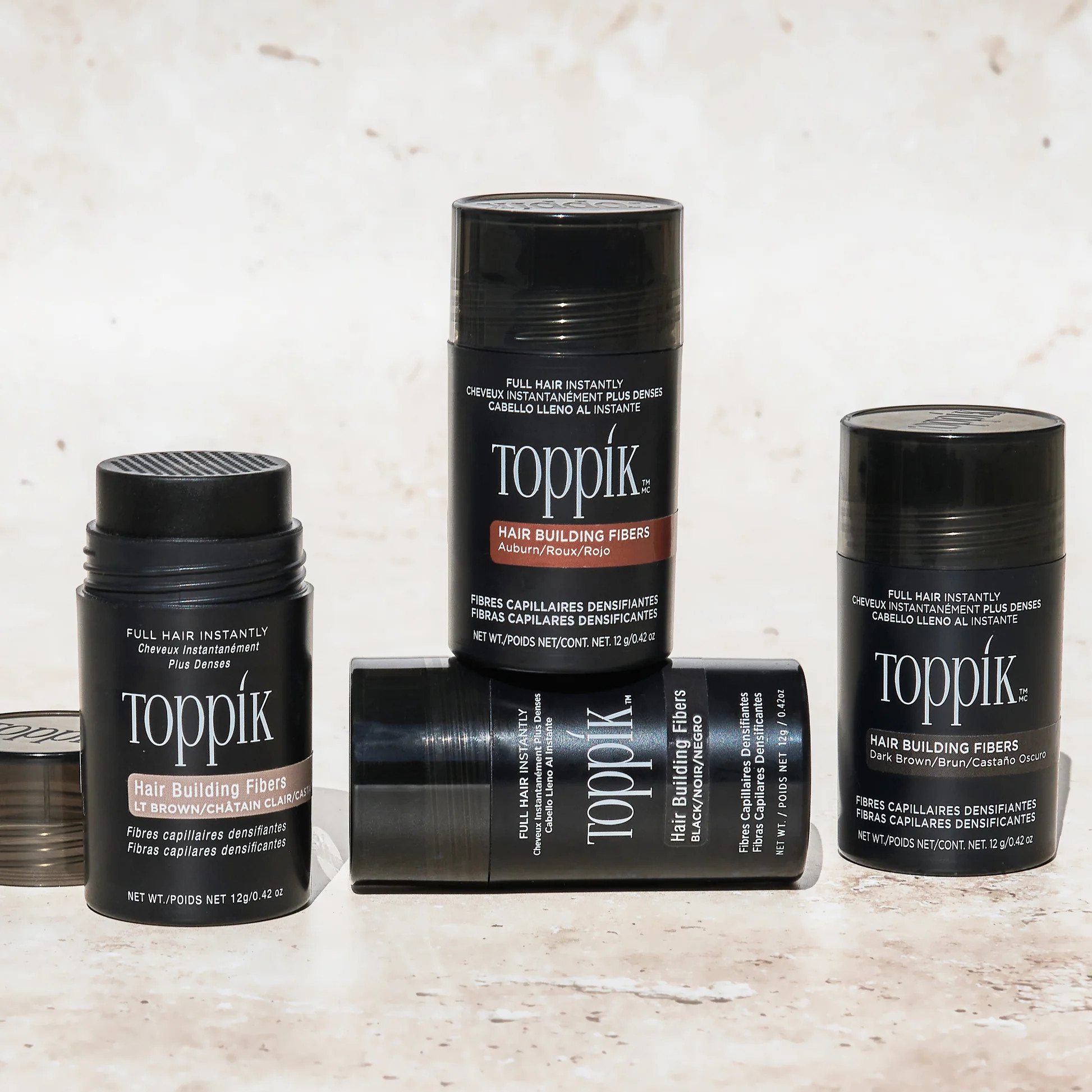 • Obarvený keratinový protein - skládá se z vysoce kvalitního keratinu, který je totožný s keratinem lidských vlasů. Vlákna mají silný přirozený statický náboj, který vytváří magnetický efekt a pevně váže barevná vlákna Toppik i na ty nejjemnější prameny lidských vlasů.