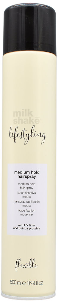 Lak na vlasy se střední fixací pro přirozený, flexibilní efekt.