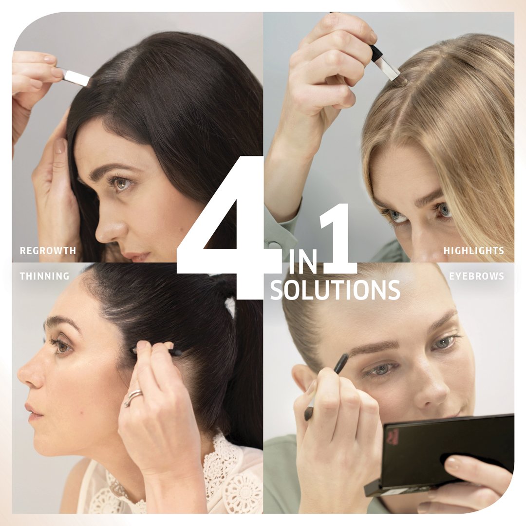Tento pudr na vlasy a obočí nabízí dočasné řešení krytí odrostů, melírů, okamžitě dodává hustší vzhled díky krytí pokožky u řídkých vlasů a je určen pro zvýraznění a definici tvaru obočí.