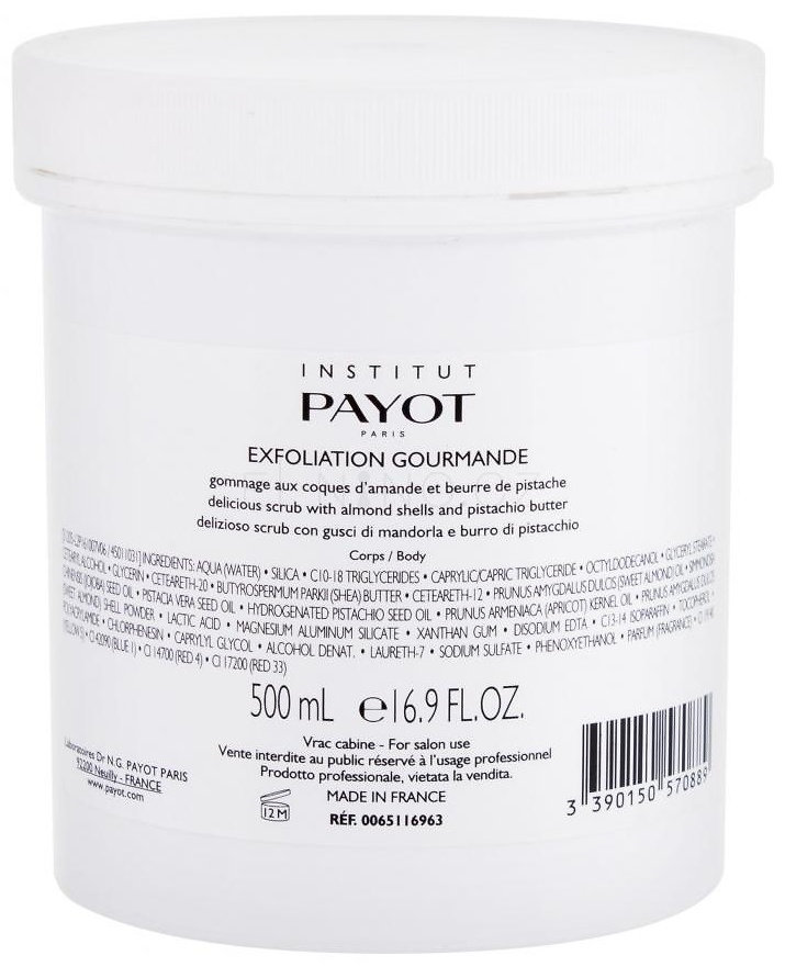 Lahodný tělový exfoliační krém, z mandlových mikro zrn a pistácií pro jemnou exfoliaci.