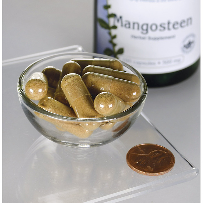 Doplněk stravy s mangostanem. Mangostan je tropické ovoce ceněné pro svou chuť a potenciální nutriční hodnotu, včetně obsahu antioxidantů a xanthonů.