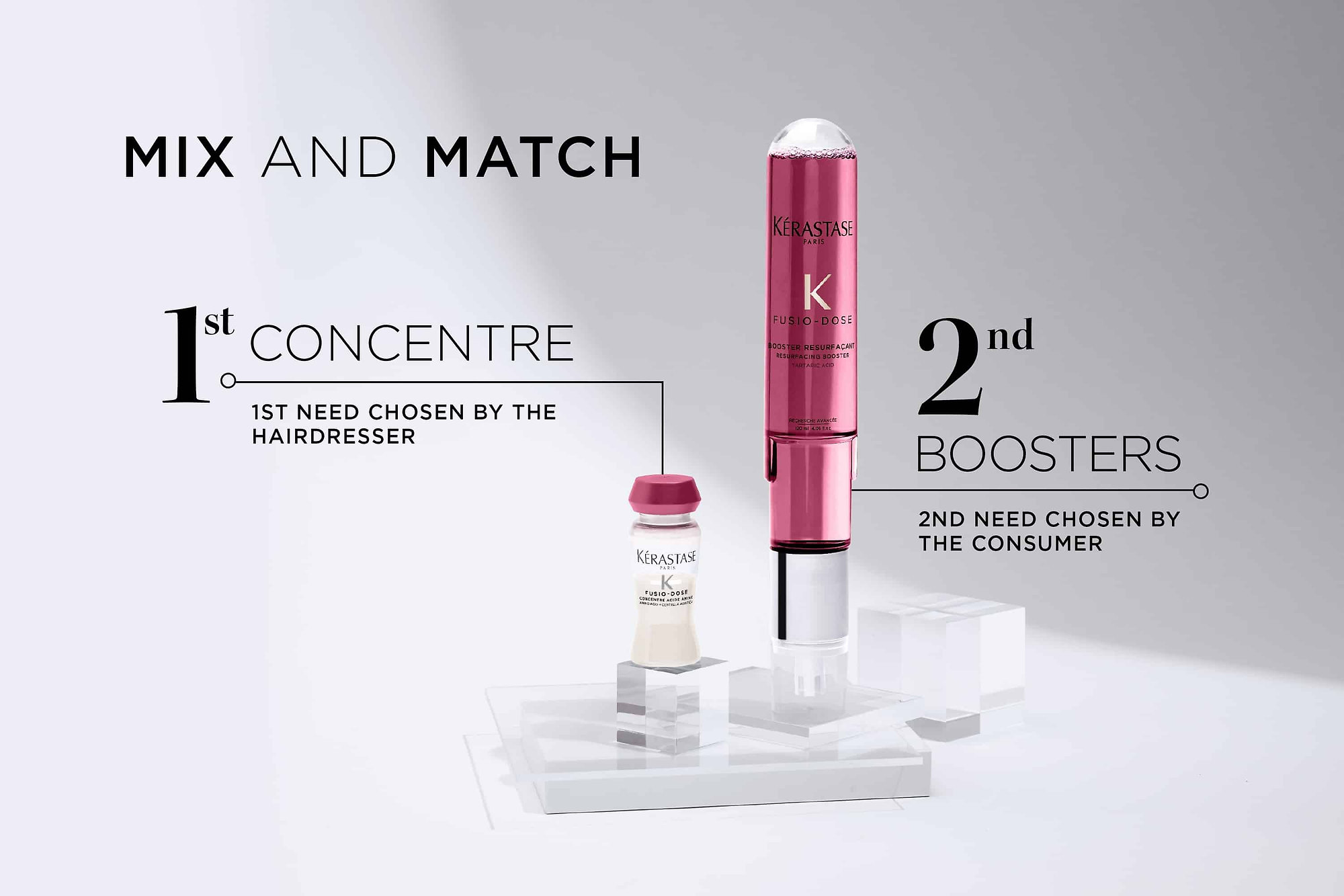Kombinace boosteru & concentré nabízí 30 různých kombinací pro ošetření vlasů najednou. Koncentrovaná kúra Concentré se zaměřuje na primární vlasovou potřebu identifikovanou kadeřníkem po diagnóze, zatímco booster se zaměřuje na sekundární vlasovou potřebu, o kterou usiluje váš klient, takže můžete mít to nejlepší z obou světů.