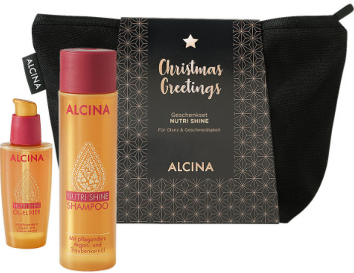 Dárková sada pro intenzivní pružnost a lesk vlasů. Baleno v čérné kosmetické taštičce s odnímatelnou papírovou páskou.