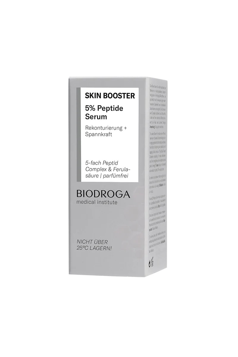 Maximálně koncentrované peptidové sérum BIODROGA Medical Institute SKIN BOOSTER 5% je odpovědí na ochablý tón pleti a povadlé kontury obličeje. Složení s kombinací 5 peptidů a kyseliny ferulové restrukturalizuje epidermis, podporuje hustotu pokožky i vypnutí kontur obličeje.