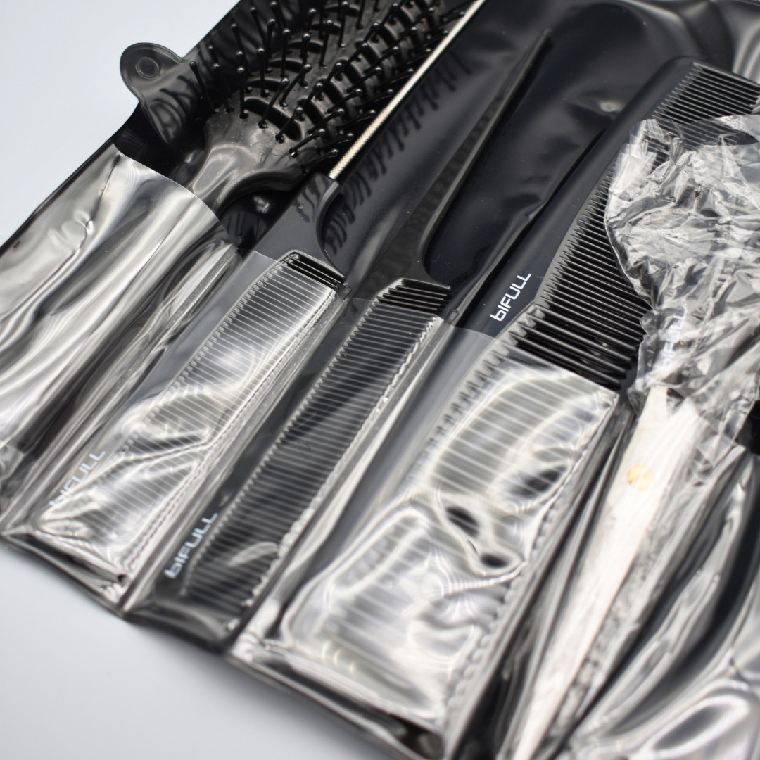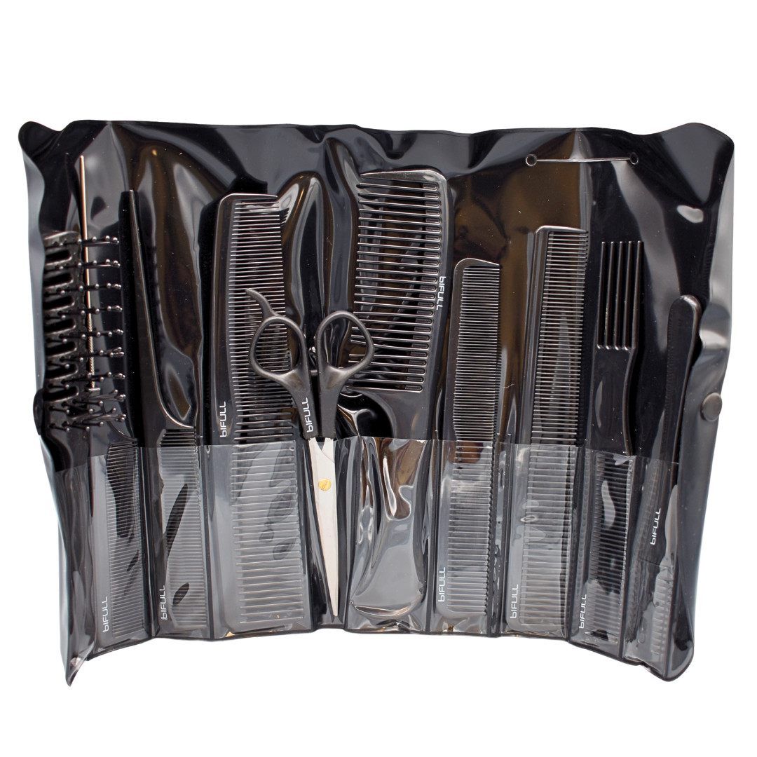 Praktická profesionální sada Bifull Suki pro střih i styling: výběr kadeřnických hřebenů doplněný o kartáč, kadeřnické nůžky, břitvu a pouzdro pro přehledné uložení.