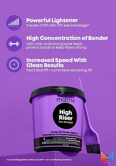 Díky jedinečnému složení s vysokou koncentrací kyseliny citronové a glycinu chrání Matrix High Riser Pre-Bonded vlasové vazby během procesu zesvětlování, čímž zajišťuje maximální ochranu a minimalizuje lámání vlasů.