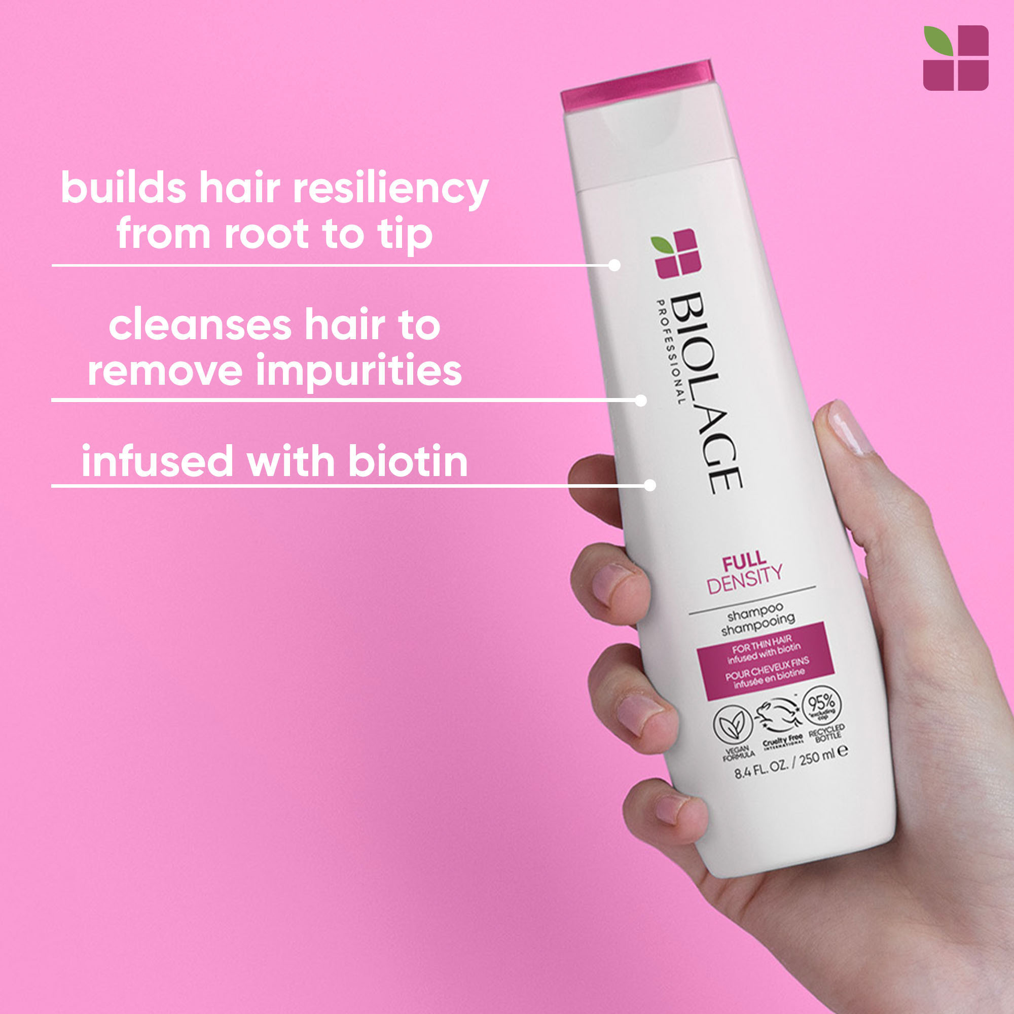 Trápí vás řídnoucí vlasy a hledáte účinný šampon, který je posílí a dodá jim objem? Pak sáhněte po Biolage FullDensity Shampoo! Tento šampon s obsahem biotinu šetrně čistí vlasovou pokožku a odstraňuje nečistoty, zatímco zároveň posiluje vlasové vlákno od kořínků ke konečkům. Již po jediném použití budou vaše vlasy vypadat hustší a zdravější.*
