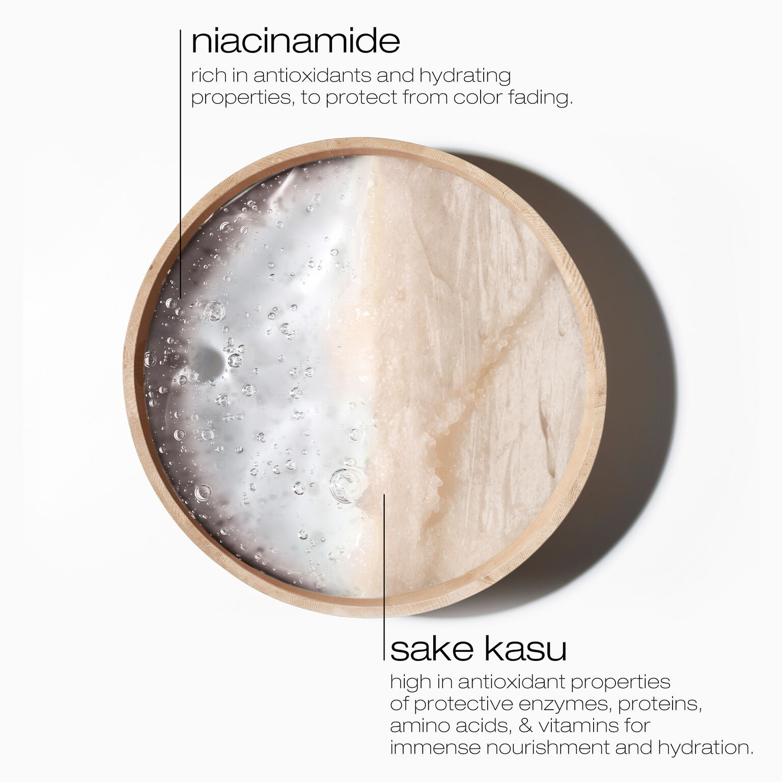 Tato intenzivně hydratační maska na vlasy je ideální pro barvené střední až husté vlasy. je obohacena o antioxidační účinky japonského saké kasu a niacinamidu pro dlouhotrvající barvu a zářivost. Odstín vašich vlasů tak zůstane intenzivně sytý a zářivý déle než kdy jindy.
