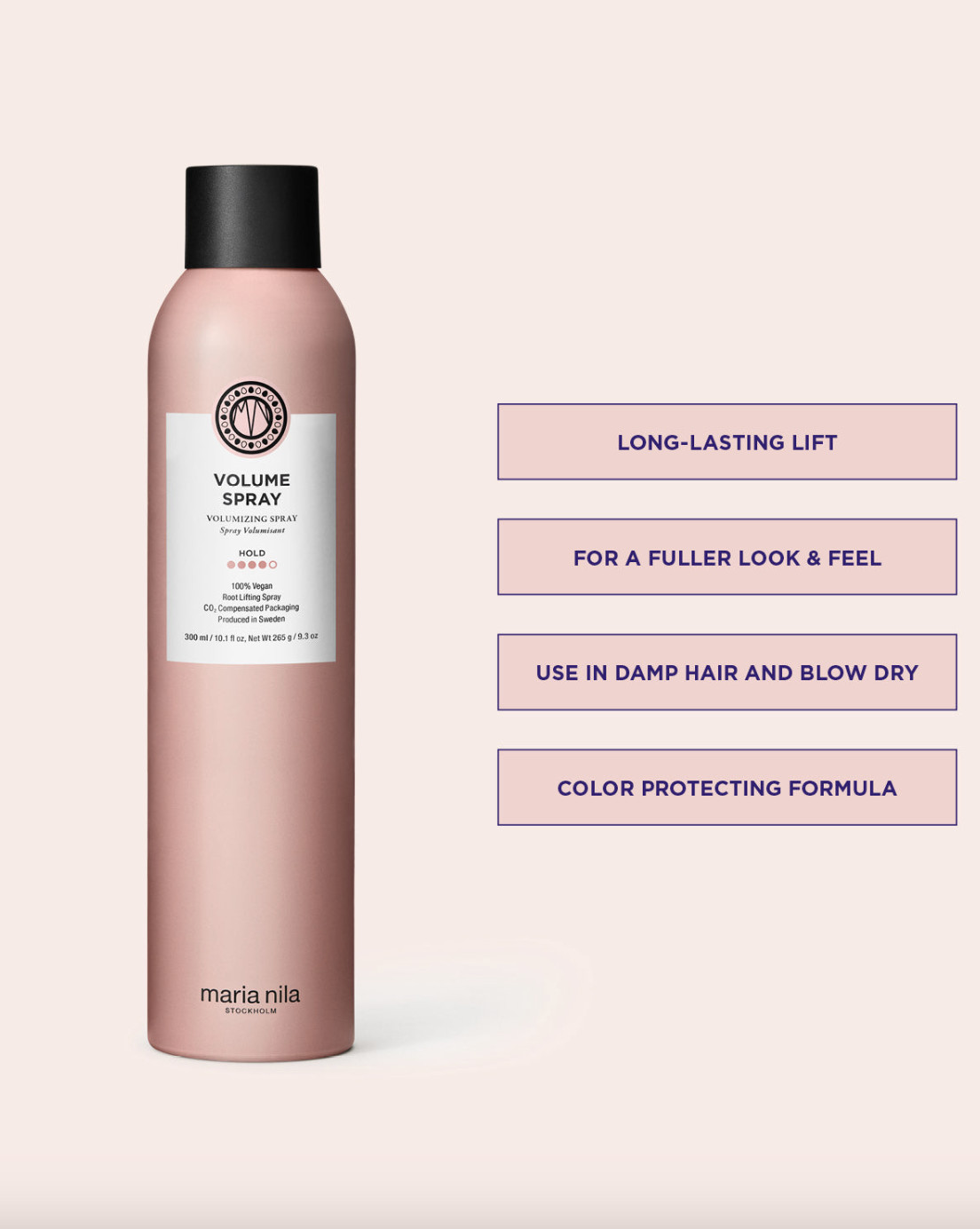 Maria Nila Volume Spray je pečující objemový sprej, který dodává vlasům přirozený vzhled bez pocitu lepivosti. Tento sprej je navržen tak, aby byl aplikován na vlhké vlasy před stylingem, pro dosažení maximálního objemu a nejlepších výsledků. Jeho ovocná vůně s tóny ananasu a ostružin činí použití ještě příjemnějším. Volume Spray je 100% veganský a neobsahuje žádné složky živočišného původu. Navíc obsahuje Colour Guard Complex, který chrání vlasy před UV zářením a volnými radikály.