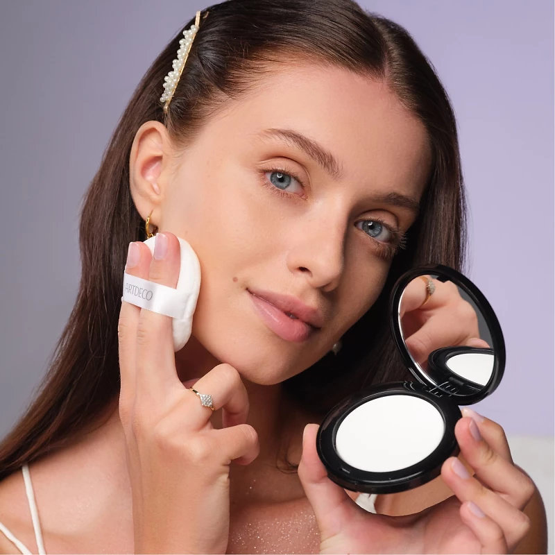 Naberte malé množství pudru na štětec a jemně zapracujte do pleti – ideálně do T-zóny nebo na celý obličej pro zafixování make-upu.