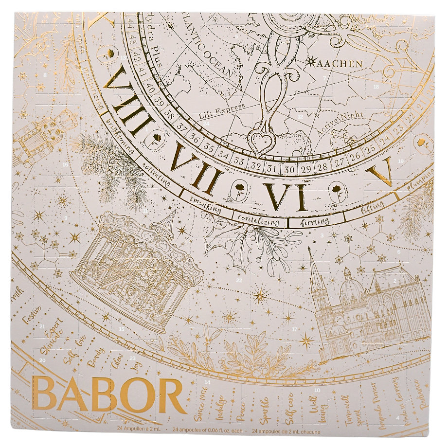 Ponořte se do kouzla adventu s exkluzivním kalendářem BABOR. Tento luxusní adventní kalendář je plný pečlivě vybraných ampulí, které regenerují pleť, hydratují ji a bojují proti známkám stárnutí. Díky tomuto výjimečnému dárku si můžete každý den užívat profesionální péči v pohodlí domova.