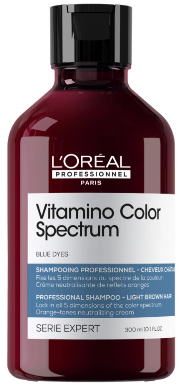 Vitamino Color Spectrum neutralizační šampon modrý pro neutralizaci nežádoucích oranžových tónů na světle hnědých vlasech.