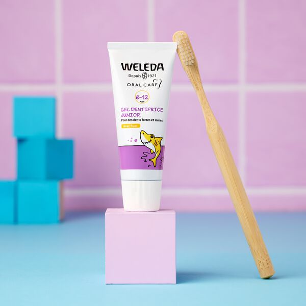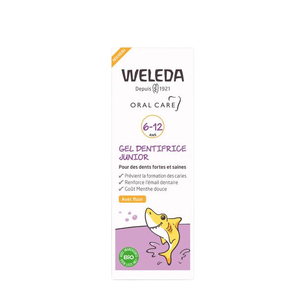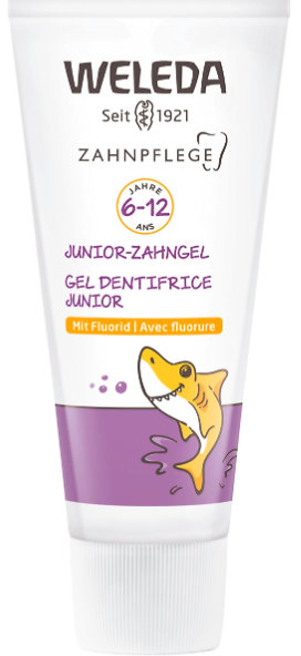 Junior zubní gel Weleda je přírodní zubní pasta s obsahem fluoridu sodného (1450 ppm), vyvinutá speciálně pro potřeby dětí od 6 let věku. Poskytuje účinnou ochranu proti zubnímu kazu, zároveň posiluje zubní sklovinu a jemně čistí pomocí minerálních čisticích složek. Výtažek z měsíčku lékařského pečuje o dásně a působí protizánětlivě. Gel má příjemnou přírodní chuť bez máty – je tak vhodný i během homeopatické léčby.