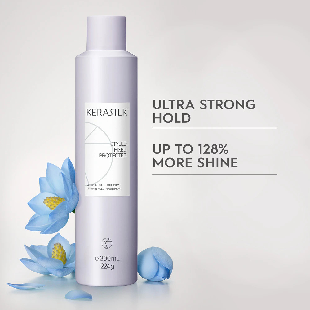 Kerasilk Ultimate Hold Hairspray je lak na vlasy s ultra silnou fixací, který zajišťuje dlouhotrvající účes až na 72 hodin. Jeho 100% veganská receptura je obohacena o biomimetické hedvábí a extrakt z modrého lotosu, což přináší nejen výjimečnou pevnost, ale i zářivý lesk až o 128 % vyšší než bez použití produktu.