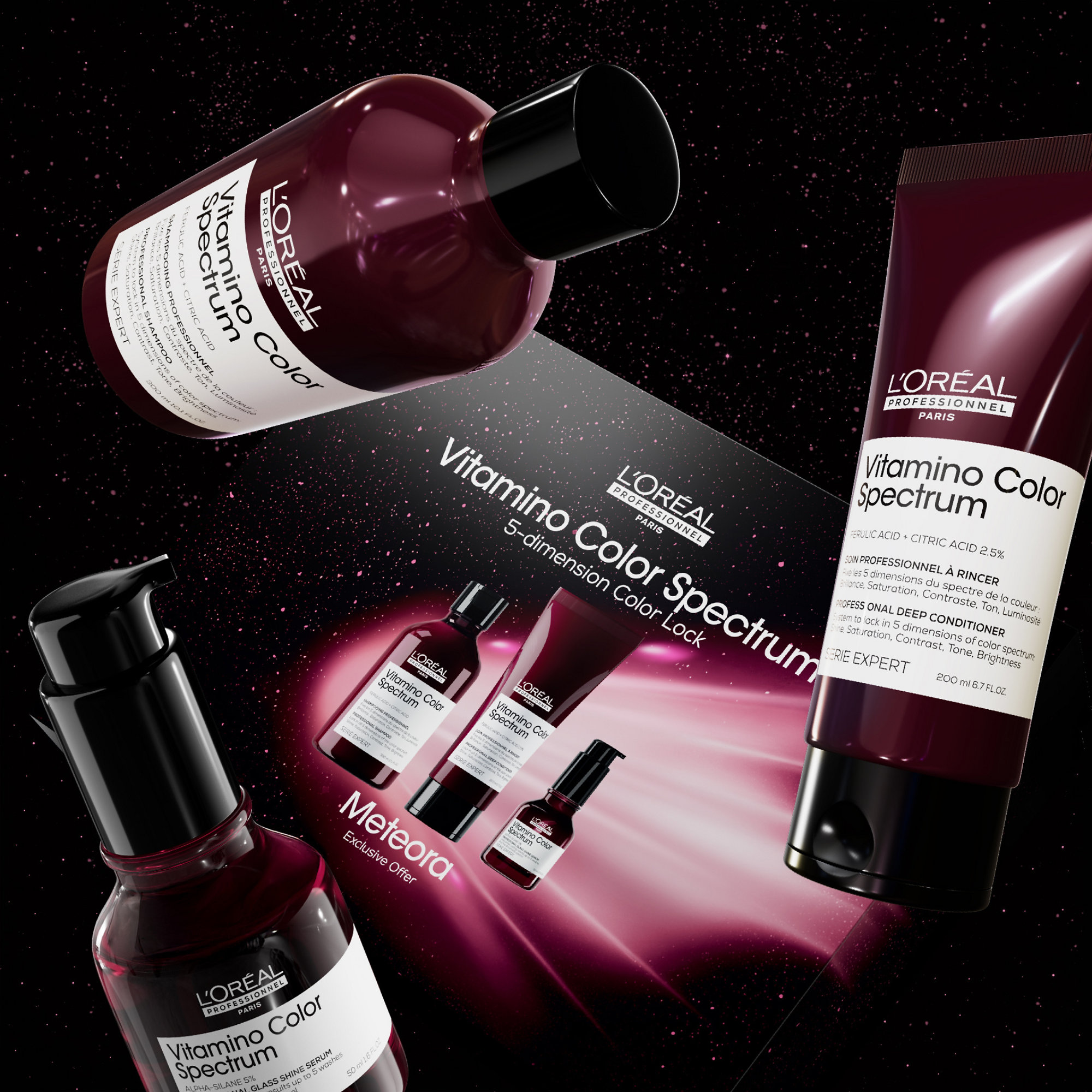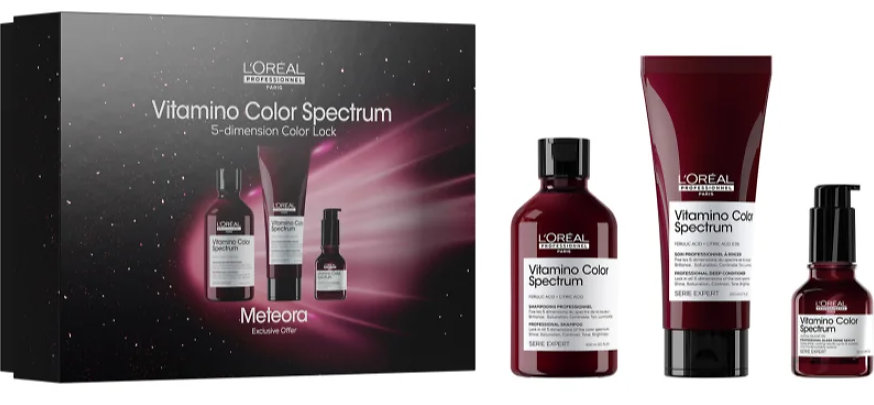 Luxusní vánoční sada L’Oréal Professionnel Série Expert Vitamino Color Spectrum Trio Meteora byla navržena pro všechny, kdo chtějí, aby jejich barva vlasů zářila stejně jasně jako vánoční světla.