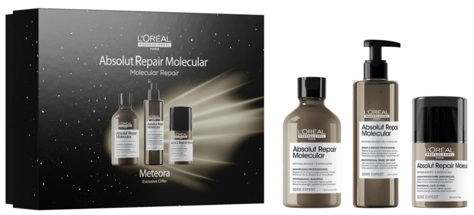 Objevte revoluční péči nové generace s limitovanou edicí L’Oréal Professionnel Série Expert Absolut Repair Molecular Meteora. Tato luxusní trio sada obnovuje vnitřní strukturu vlasů na molekulární úrovni a vrací jim sílu, pružnost i lesk – jako po profesionálním ošetření v salonu.