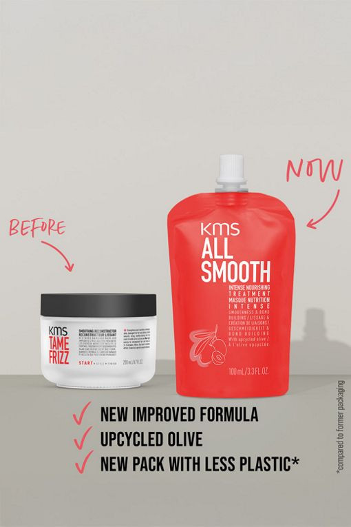 FOR STYLISTS SALON FINDER SEARCH KMS_Evo3_AS_3DRangeShot_colored ALLSMOOTH KMS HAIR AllSmooth products provide intense nourishment and frizz & humidity protection for up to 72 h*. * Regimen with Shampoo, Intense Nourishing Treatment, Smoothing Lotion and Intense Nourishing Oil. BACK TO ALLSMOOTH ALLSMOOTH INTENSE NOURISHING TREATMENT Deeply nourishes and increases smoothness for healthy looking hair full of shine. Builds bonds¹ for up to 20 times stronger hair. 1 Hydrogen & Ionic Bonds. SMOOTH BOND-BUILDING NOURISH wavy coily1 HAIR TYPE: WAVY TO COILY Key benefits SMOOTH • Up to 50% smoother hair.¹ • Frizz control, improved manageability and intense smoothness.² • Up to 3 times easier detangling.¹ • Intensively smooths the overall hair structure and surface for a soft feel with shine. BOND-BUILDING • Up to 20 times stronger hair.¹ • Reduces breakage and split ends by up to 99.% • Up to 99% more elasticity.¹ • Bond-building3 formula restores the protein structure responsible for hair’s resilience. • Builds bonds3 inside the hair. • Helps prevent damage. NOURISH • Immediate restores strength, softness and smoothness that last. • Rich formula deeply nourishes hair fibers to restore dry strands and protect the hair. • Strengthens and nourishes dehydrated hair. 1 vs. untreated hair 2 with regular use climate_partner Application Apply to shampooed lengths & ends. Leave in for 3-5 minutes. Rinse. Fragrance A sensual fragrance combining vanilla, woods and musk with the freshest sea breeze. TOP Lemon, Mineral Accord,Marine Accord, Pink Berries HEART Tiare, Clove, Peach, Algae BASE Sandalwood, Heliotrope,Tonka Bean, Vanilla Milk, Musk Ingredients ALLSMOOTH INTENSE NOURISHING TREATMENT Art. No. 104009 Upcycled Olive - AllSmooth formulas with upcycled olive, provide intense nourishment and restore the hair from the inside for smooth, soft hair.Formulated without SLS/SLES sulfates¹, mineral oils, silicones, colorants or PEGs. Water/Aqua/Eau, Cetearyl Alcohol, Behenamidopropyl Dimethylamine, Cetyl Alcohol, Hydroxypropyl Starch Phosphate, Steartrimonium Chloride, Behentrimonium Chloride, Isopropyl Palmitate, Lactic Acid, Dipropylene Glycol, Isopropyl Alcohol, Panthenol, Tetrasodium Glutamate Diacetate, Hydrolyzed Olive Fruit, Glycine, Soy Amino Acids, Wheat Amino Acids, Arginine HCl, Serine, Threonine, Citric Acid, Benzyl Alcohol, Sodium Benzoate, Potassium Sorbate, Fragrance/Parfum, Anise Alcohol